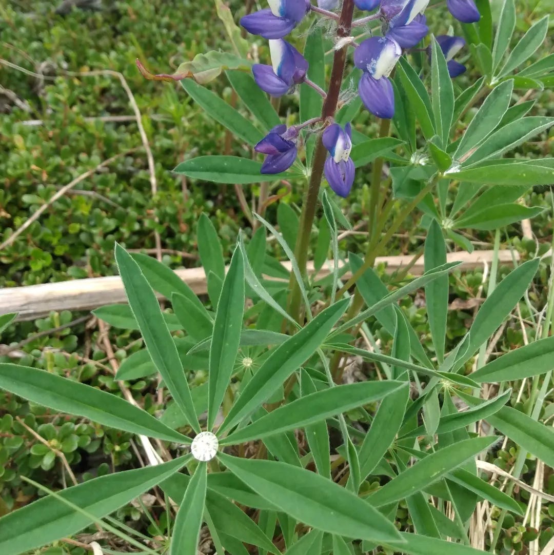 Lupine’s splendor is much to be enjoyed. There is the attraction of the flowers, erect and purple as they spring forth in early summer and the water magic of dewy diamond drops in the leave’s center. It seems all the more romantic to think of ingesting the seeds held within fuzzy pea pods (ok that all sounds more sexier than I’d intended- Lupine erotica anyone?!🤣)